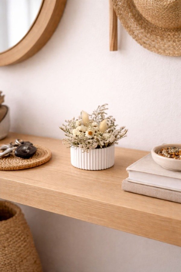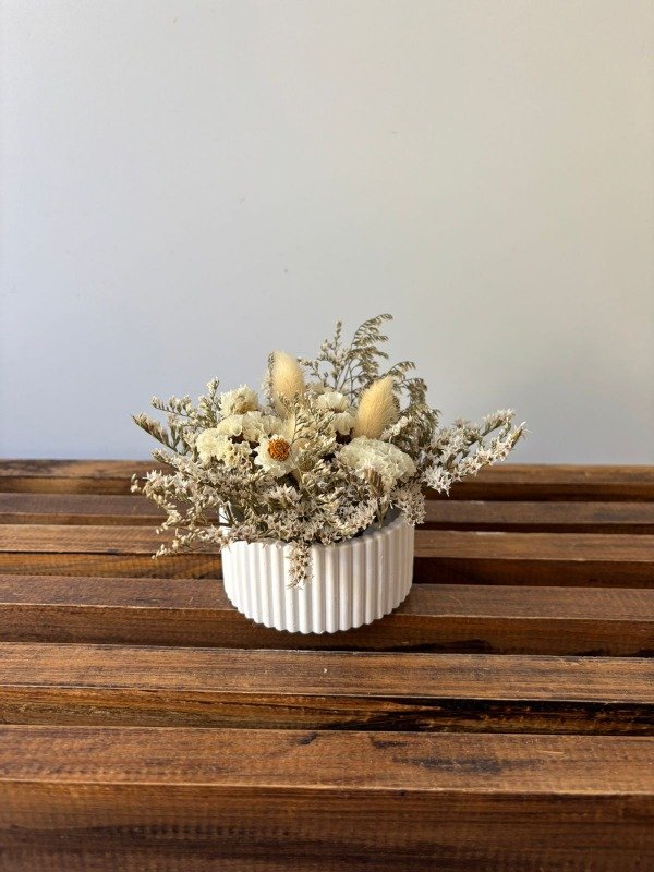 Mini centro de mesa o florero de yeso con flores naturales secas en color blanco y natural Medidas de la base Alto: 4 cms Ancho: 6 cms