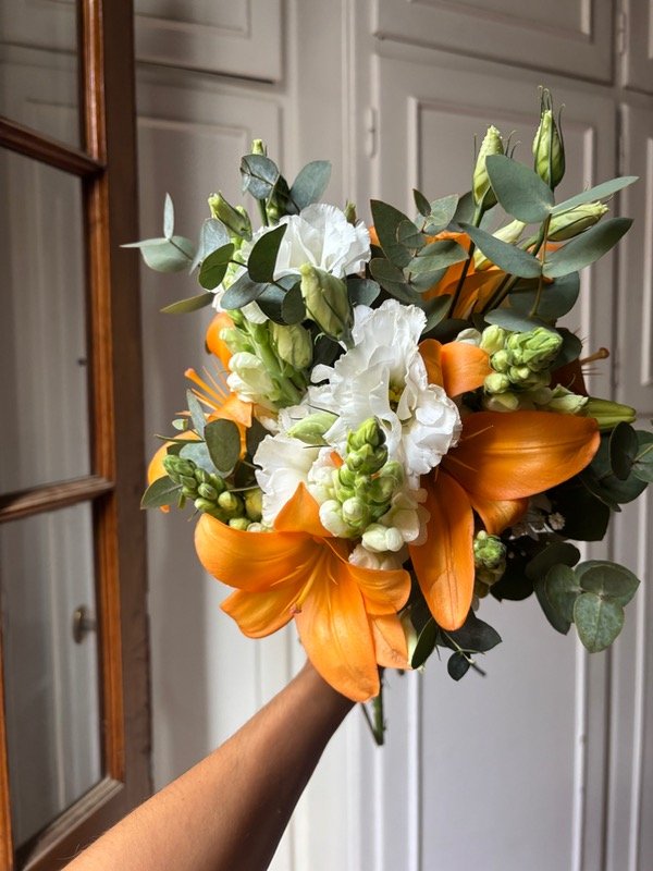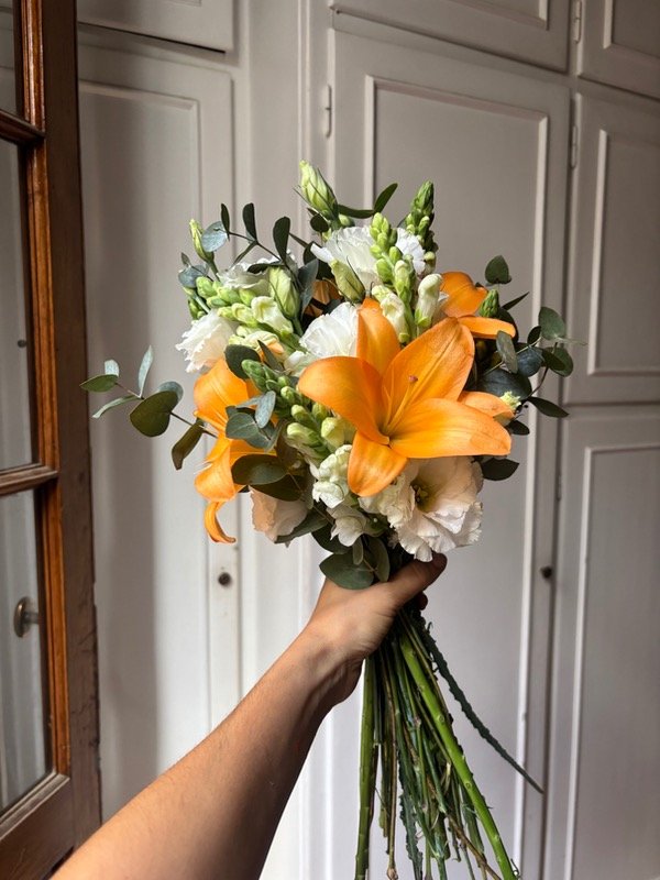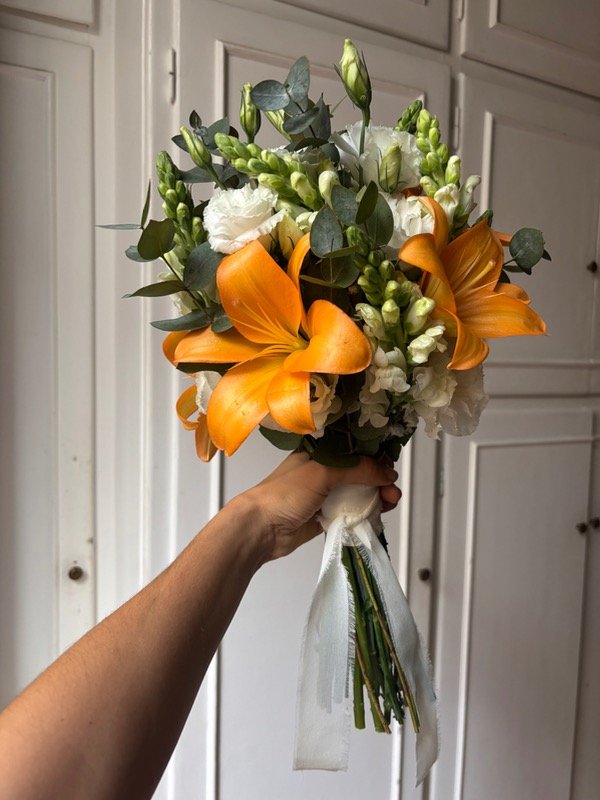 Ramo de flores frescas con lilium naranja (puede ser blanco o rosa) lisianthus y conejito (estas dos variedades también disponibles en color rosa)
