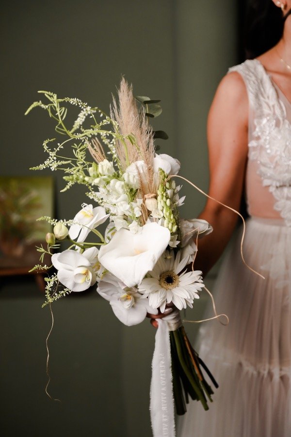 Ramo de novia alargado mix seco (pampa grass, amapolas) con fresco (conejito, orquidea, gerbera, cala)
